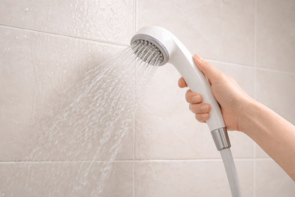 掃除を始める前に、シャワーで壁や床に熱めのお湯をかけて、浴室全体を「蒸気」で満たしてあげましょう。